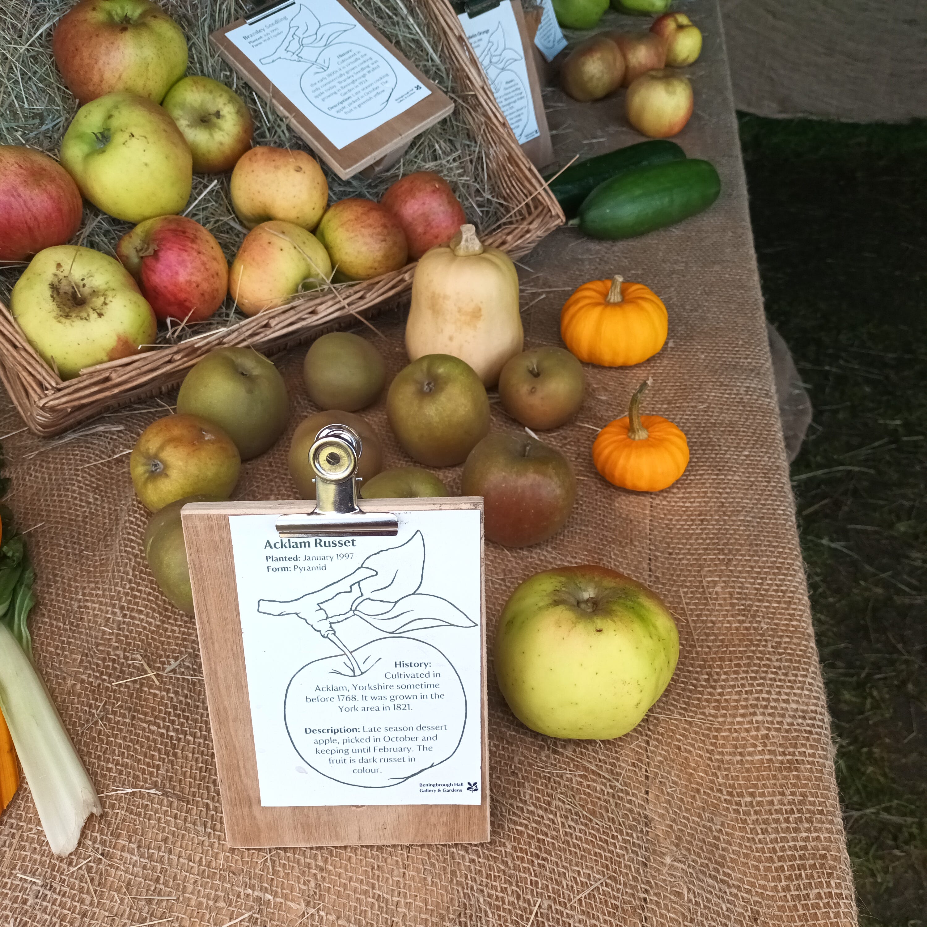 The apples the monks planted are long lost to history. But at Beningbrough Hall, the National Trust garden near me, is the orchard preserving old and local varieties of apples. In October they display dozens of different varieties of fruit, and offer talks on how the orchard has been planted and planned. Two years ago, my daughter dragged me there for my 39th birthday. Although she was only six, it took her the briefest glance at the wooden crates of apples, the bowls of medlars and quinces, to recognise this was my kind of thing, and hers. We found our Acklam Russet. One of the gardeners began his talk, she skipped away to run through the the tiny floor maze set out under the trees.